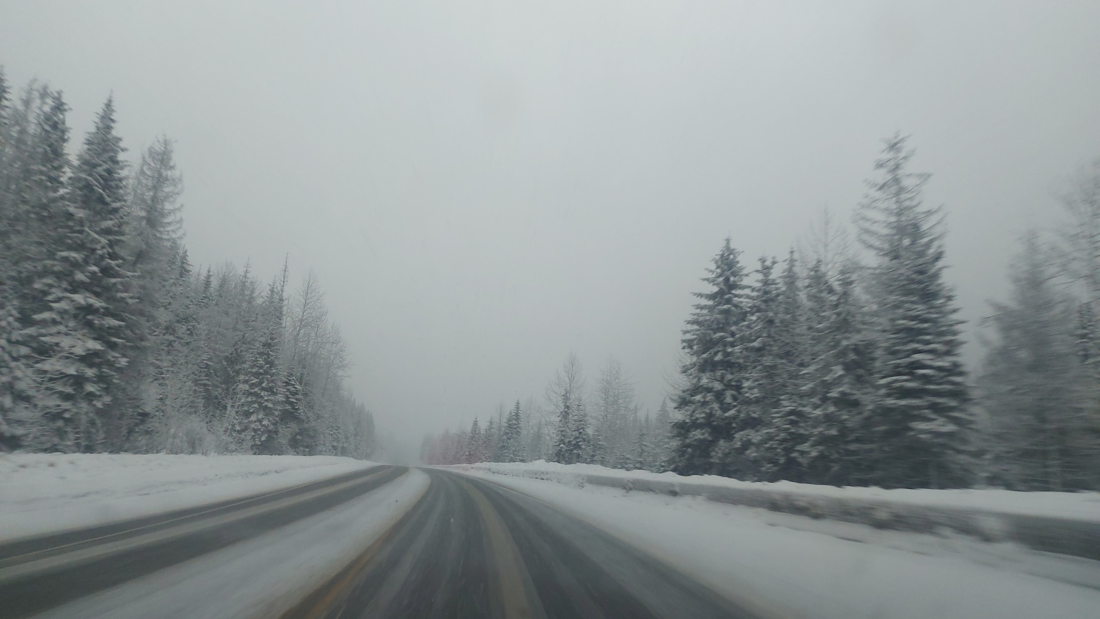 But I'm tossing in this picture to one side, which does capture the snow and trees zipping by, once we were able to get all the way up to 80kph.