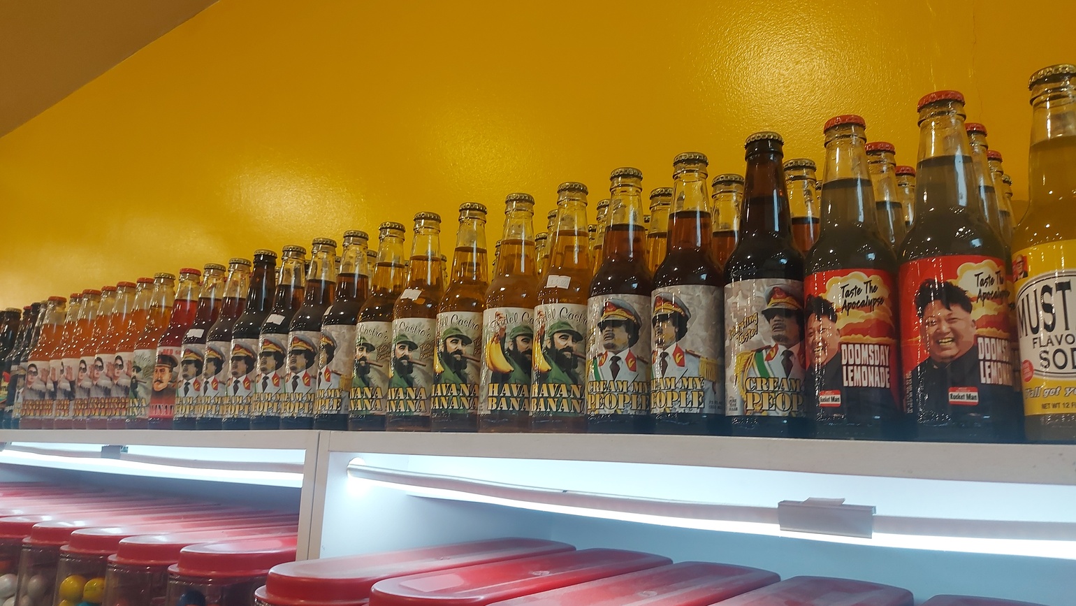 I am suffering limited photographic offerings, I admit. Today, I'm down to the funny "Dictator Sodas" I saw in the Candy Store the other day. (I've been trying to avoid the place like it was a heroin shop, but the other day I slipped up.) I hadn't noticed on previous visits that they have this line of soft drinks along the top shelf, with portraits of the worst dictators: