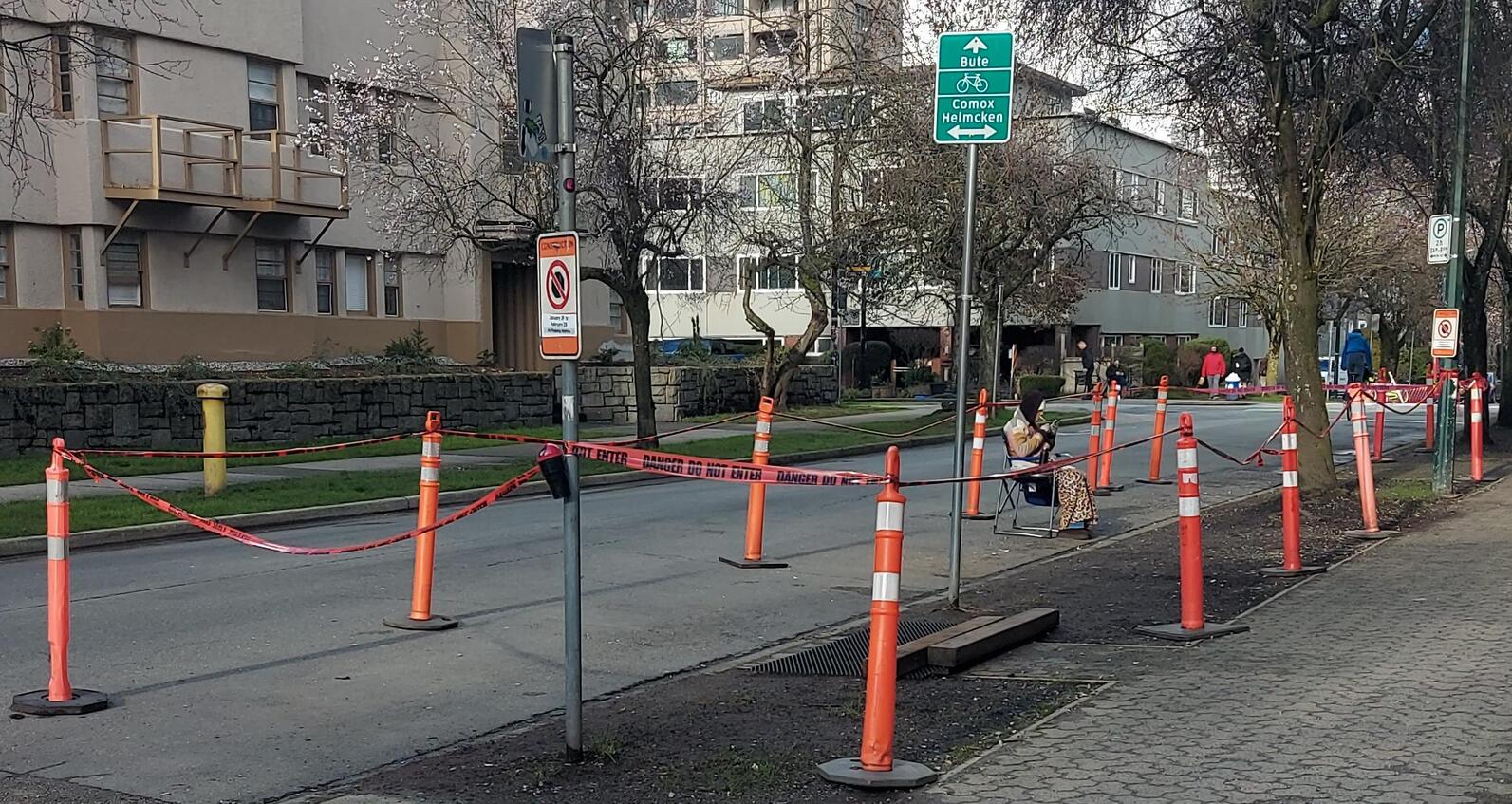 Now, you can see the tape is really about the re-paved road patch, but this lady's decision to sit WAY outside her apartment, in the "Danger tape" zone, for a smoke, sure makes it look like the anti-smoking laws have gone way too far.