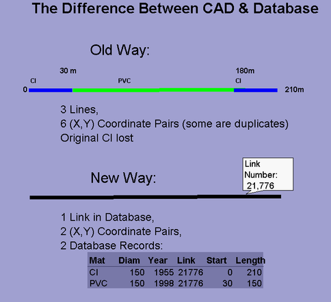 I wanted it clear in the database structure, that when a replacement chopped up a previous pipe, what the original situation had been. This 20-year-old slide illustrates the solution:
