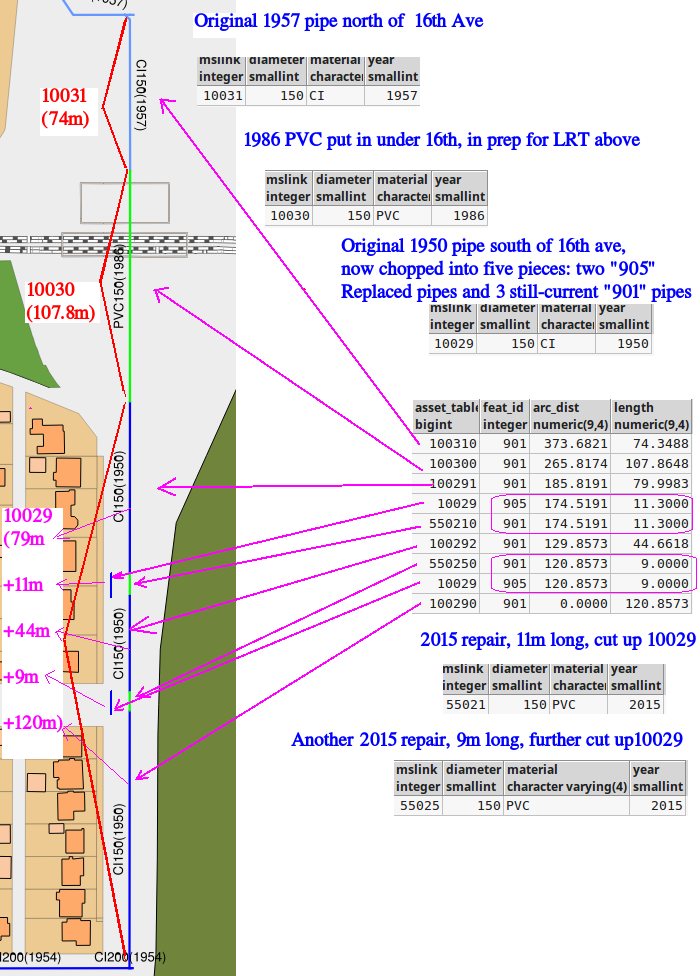 There are a total of seven "901" records, current pipes. The first two are an original CI put in 7 years later in 1957 (Calgary may have kind of ended at 16th avenue in 1950); and the 1986 PVC installed under 16th avenue so that we wouldn't have to worry about ever digging up the LRT.