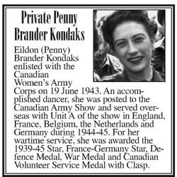 Brander, Eildon [Conybeare]. Dear Mom and Pop: The Overseas Letters of Private Penny. Edited by Brett Clifton. Lethbridge, Alberta: [s.n.], 2012. 180 pp. illus. ISBN: 978-0-9812747-2-0. Pbk*. The author, known most of her life as Penny Brander, was a Canadian dancer who trained, in part, under Adolf Bolm in San Francisco. She enlisted in the Canadian Women's Army Corps in 1943, and then successfully auditioned to be a part of the Canadian Army Show, which entertained the troops overseas. This is her account of that experience in sixty-six lively letters to her parents. Beginning in December 1943, Penny's parents agreed to allow the Lethbridge (Alberta) DailyHerald to publish some of her letters under the heading "With the Army Show: The Overseas Letters of Private Penny."