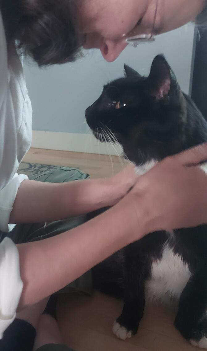 I'd better do another picture of Felix clearly not-suffering and getting attention. He doesn't want much: spends most of his days under the bed, which is not that unusual. When he comes out to lie on the floor for a bit, he often heads back to the bedroom if I start petting him. Always was a mostly-solitary cat.