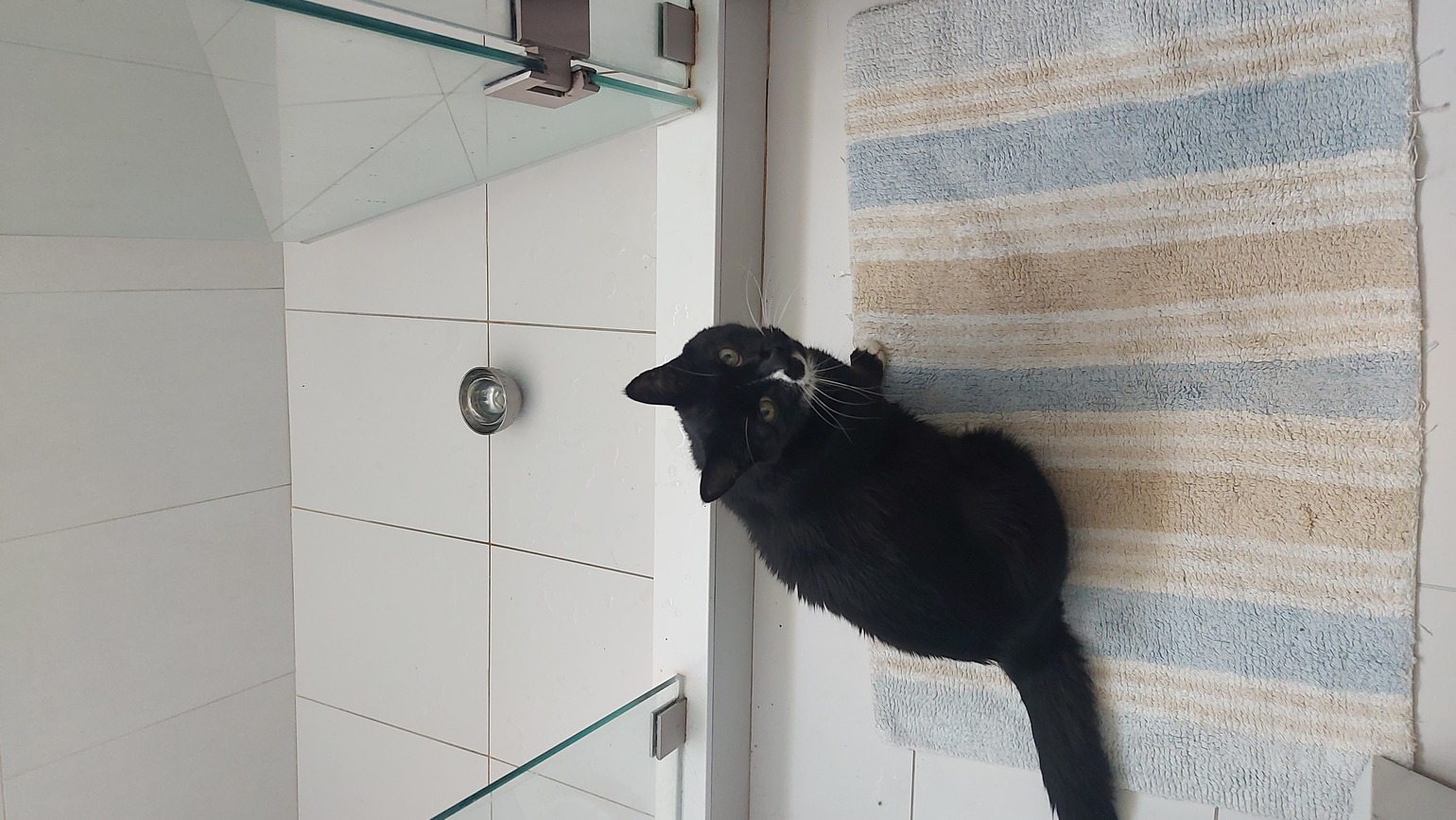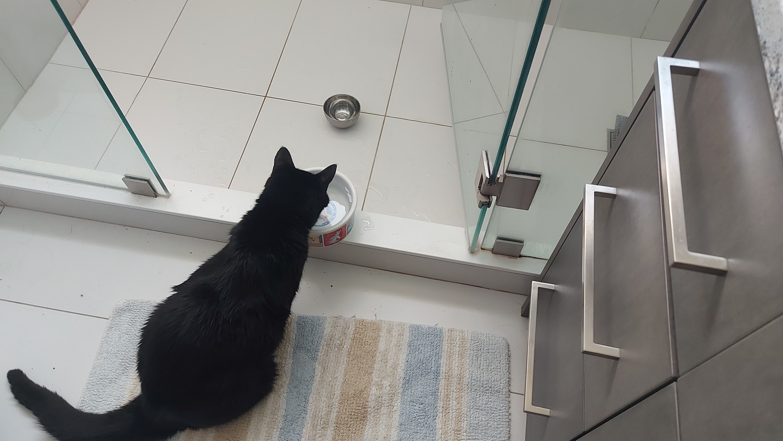 At least, his expensive little kitchen bowl with the little fountain, is now being ignored. But nobody can go into the bathroom, day or night, without this sight of Felix by his little water bowl. And he dutifully drinks a few spoonfuls every time, day or night.