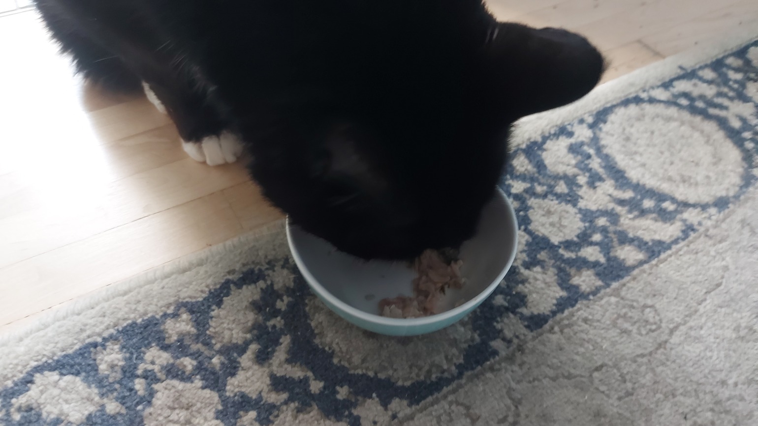 This is pure salmon, from a human-food can. He's lost interest in just about any of his cat food, and I turned to human tuna and salmon to perk up his eating. He's eating less every day, almost, and has lost weight. There's little question in our minds that his final decline from kidney disease, some 2.5 years overdue at this point, has finally come. It's as sad as sad can be, obviously, but we are consoling ourselves, that kidney disease comes with no suffering, just loss of appetite. He's still our little cuddle friend every evening, and enjoying lots of treats; still an appetite for them.