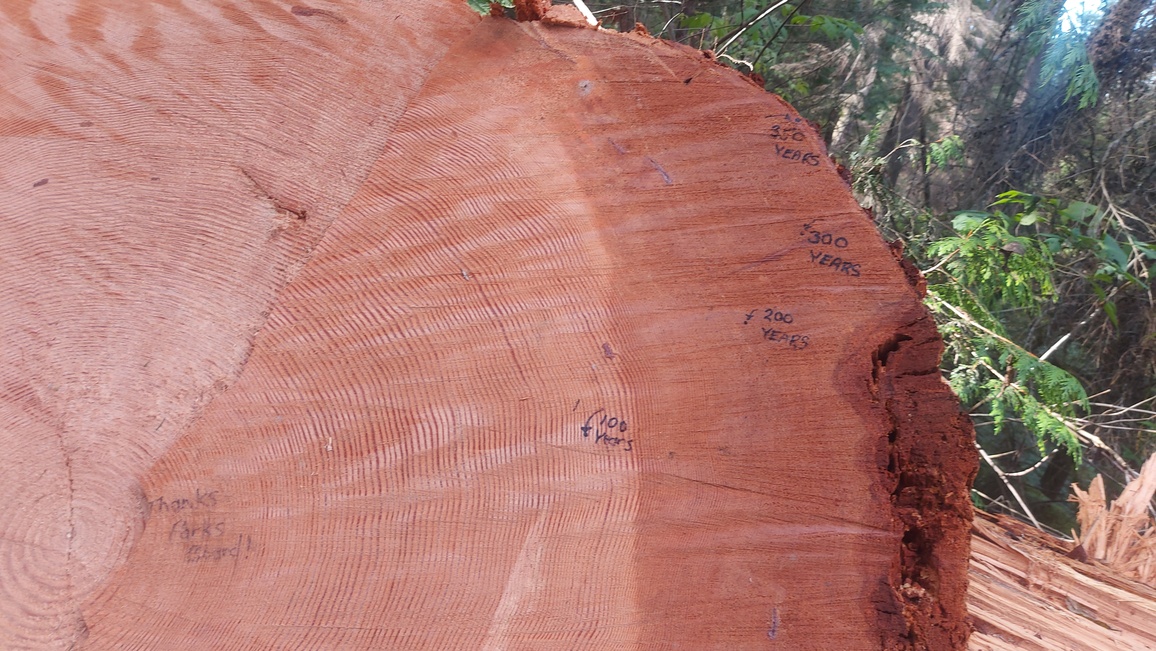 And at right, some helpful passers-by actually counted up the tree rings, and you can see how much slower growth gets after the first hundred years; the 50-year marks get closer together as they reach the outer ring. Quebec City was just being founded when the tree first grew. Jamestown was not yet there; the whole continent was still owned by the natives.