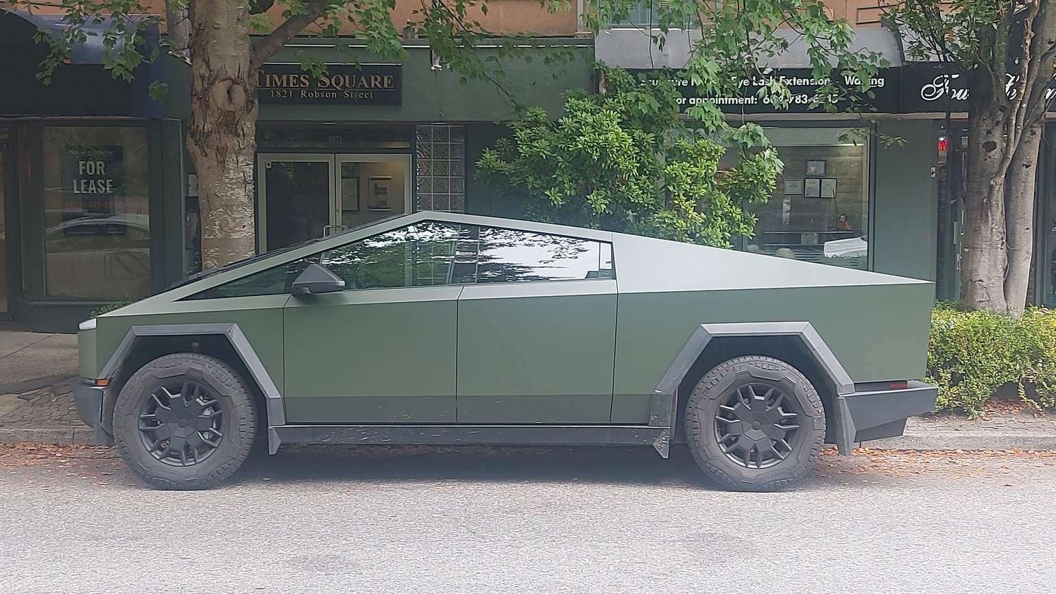 But we'll start off the day with the remarkable sight of a painted Cybertruck. These despised and mocked Tesla products are hugely expensive and not common, even in eV-crazy Vancouver. Far more rare, one that the owner has had painted from their dull metal finish. This one almost does look military with the olive-green choice. Well, let's applaud the owner's courage. And budget.