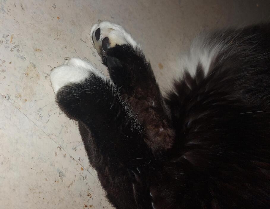 In other news, as I noted on the phone just now, Felix almost hearty eating of yesterday has disappeared, though he is still drinking. However, other symptoms of kidney failure are appearing, particularly the swelling of both front and back legs on the left side of his body. I think you can see that here, in the one shot I could get just now: he's under the bed most of the day.