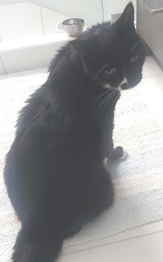 Sorry to alarm you the other day, Dora, with that picture of Felix. The problem is that he really prefers dim places, and I can only get a good picture with a flash - and taking pictures of a cat with a flash can make the eyes turn all sorts of weird colours. I've had to brighten up the bathroom picture on the right, from this morning, but as you can see, Felix is only thinner (with some swellings) and otherwise looks all right. He did a bunch of purring for me this morning, genuine purring as I petted him, he's not in real discomfort quite yet.