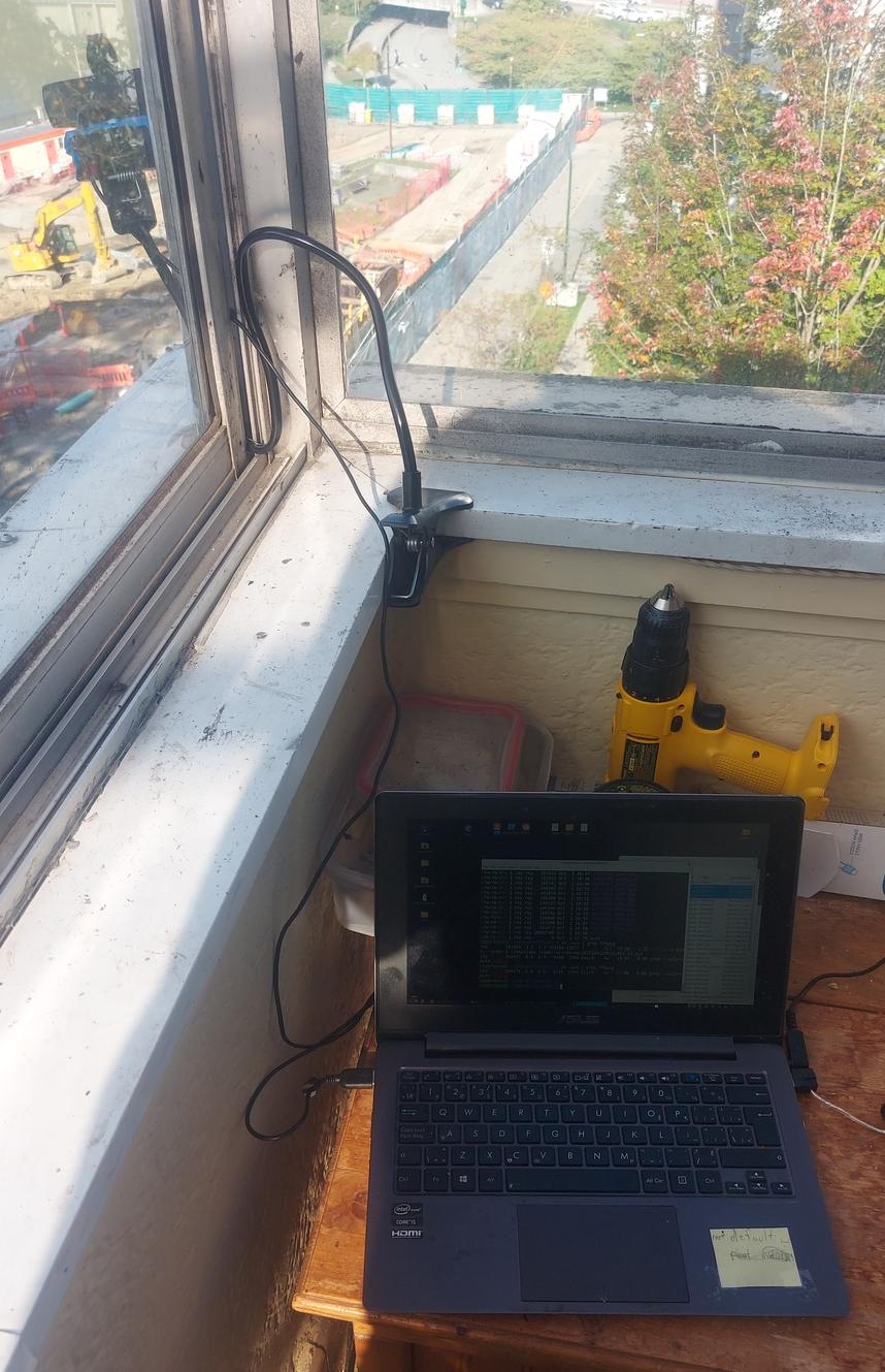 On the left, above, is my webcam project. You can see the tiny camera held by a wire and a clip just outside our corner window, and the now-redundant "vacation computer", very low power and size, recording pictures and sound files from the construction site right below it. Below this, an ad for the product it is monitoring: the "Hydrovac" digging machine, many of them made in Calgary. And all of them putting out 90 decibels at my window face. The operators are going to get hearing damage.