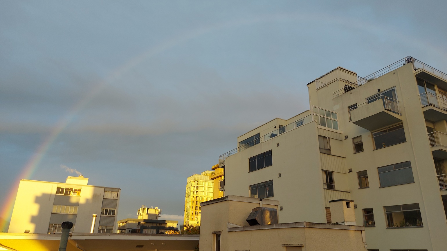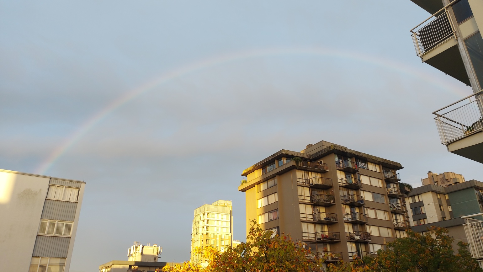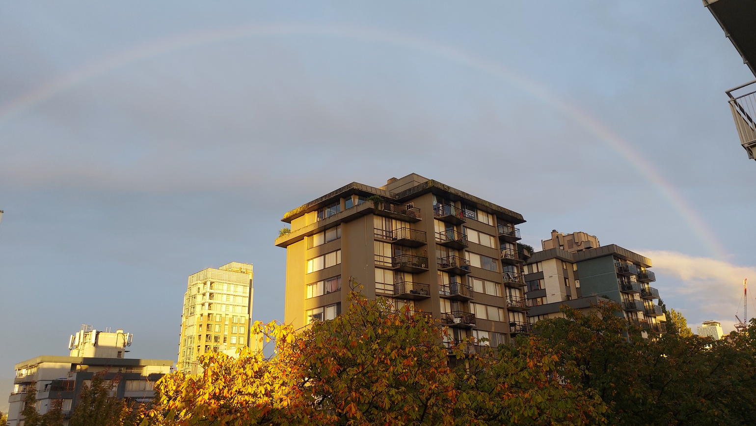 I'll just put one comment up here, and show all three of my pictures on September 29 below. When I got out onto the roof, I realized that the double-rainbow was a full "bow", a semi-circle above the entire city. I got the best shots I could.