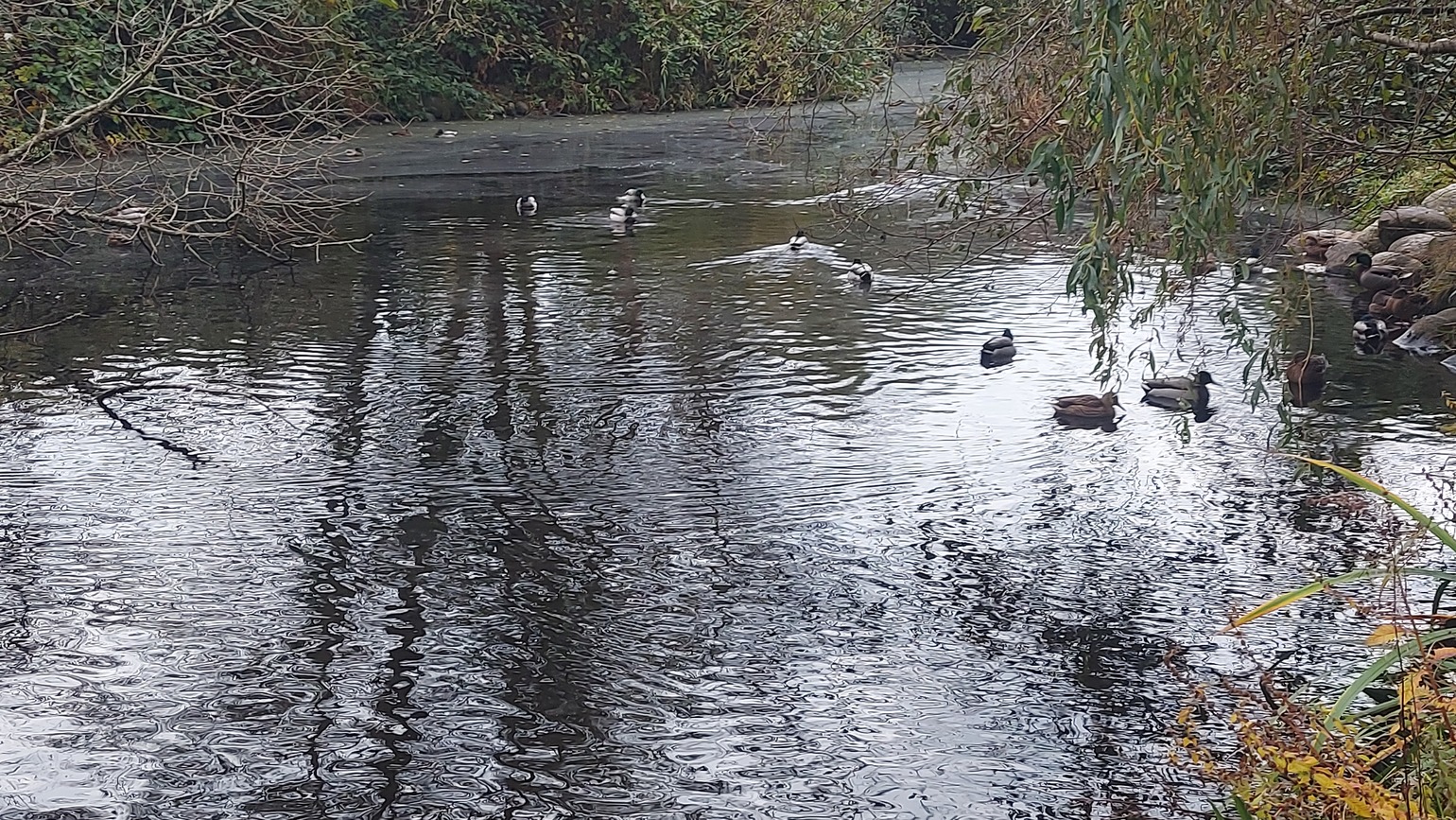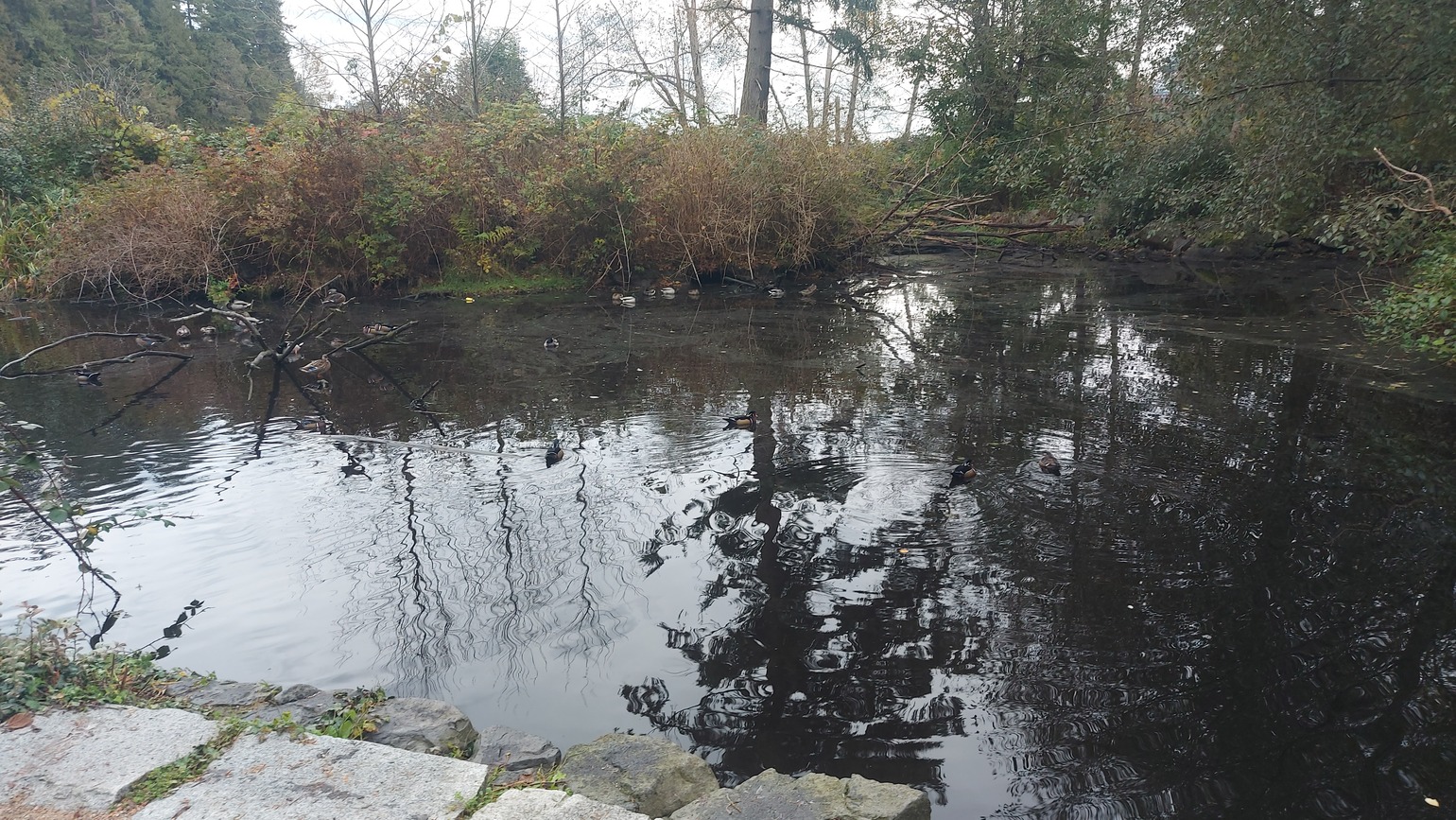 We've had even more rain, pushing water out of Lost Lagoon and down to the sea, and the rest of the algae went with it. Whew. I am happy to correct my concerns that there were weird ducks that liked the algae, the other day. They just really liked that quiet corner of the Lagoon, enough to tolerate it. Now they are happily there with the algae gone: