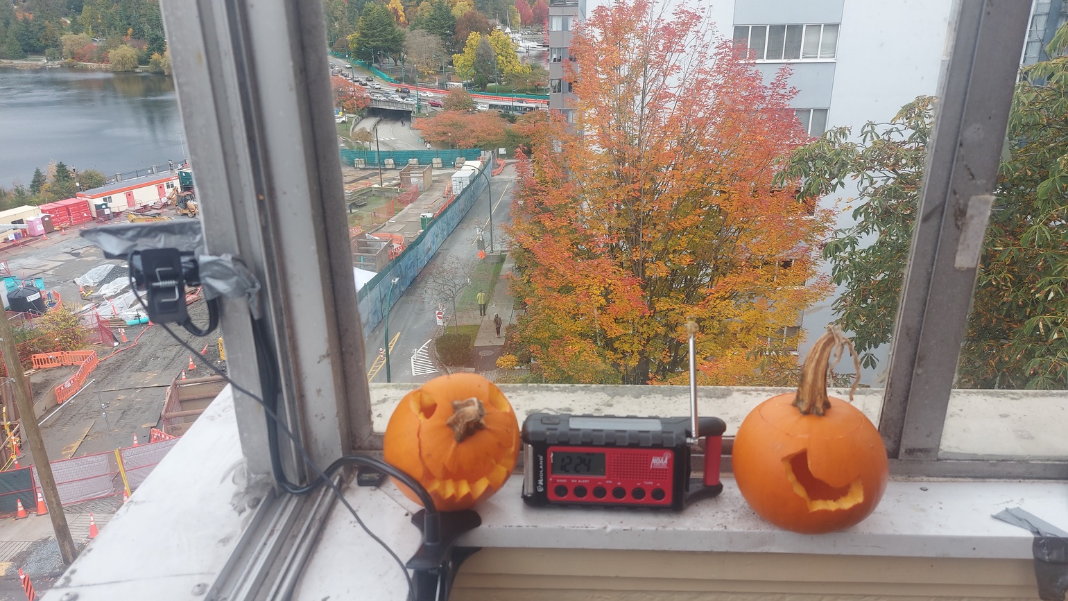 At the webcam, all is chugging along well, saving about a gigabyte a week of pictures and sound files. Beside the webcam, today, are the two smaller pumpkins Connie and I carved yesterday at the Building Pumpkin Carving Event. We did a larger one, too, I'll show that at Hallowe'en.