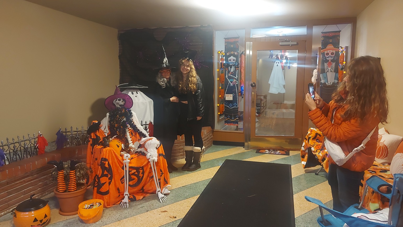 So four or five of us, at various times, were out to greet any kids that came by the far West End of Vancouver, and you know, we got several! Sam Hall, who did this whole extravaganza along with Nellie Moreno, poses with new resident Stephanie Deutsch, who was also huge help. Thanks!