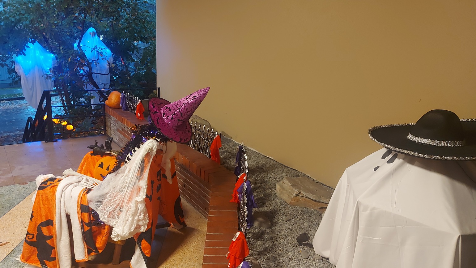 Dead Fred, Sam's skeleton crew, as it were, poses in his own chair,pulled from inside. The Board decided that all visitors must only be greeted outside, so we hauled out all the best inside decorations (see yesterday) to the front step.