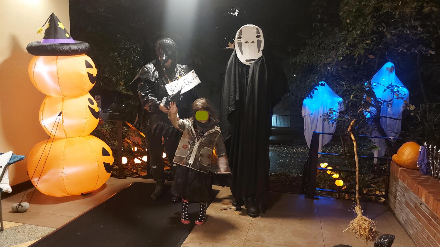 One trick-or-treating family, all in costume as the "West End Crows", posed for a photograph. But to be on the safe side, their little girl's face is redacted. Sorry...but No Kids on the Internet.