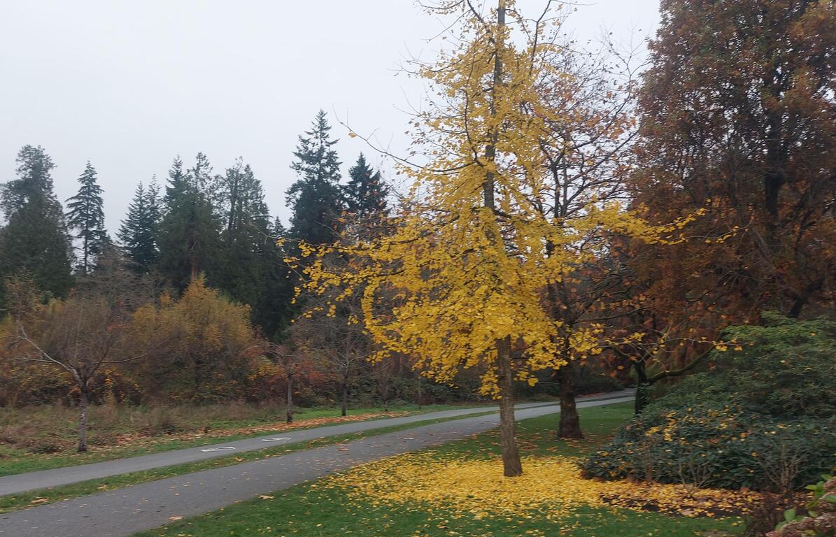 The leaves are mostly down, now. There are a few very colourful trees left, but if you look to either side of it, the park is going dusky green and grey.