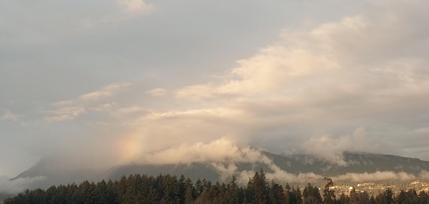 I got more pictures of trees, today, but a weblog is at it's best if it logs the current day and moment. This picture was taken five minutes ago. Impossible to get sharp focus when it's using software to magnify, but you still get the picture. Just at sunset, with the homes on Grouse Mountain all reflecting it, a little rainbow appeared a ways west. This place is just magic.
