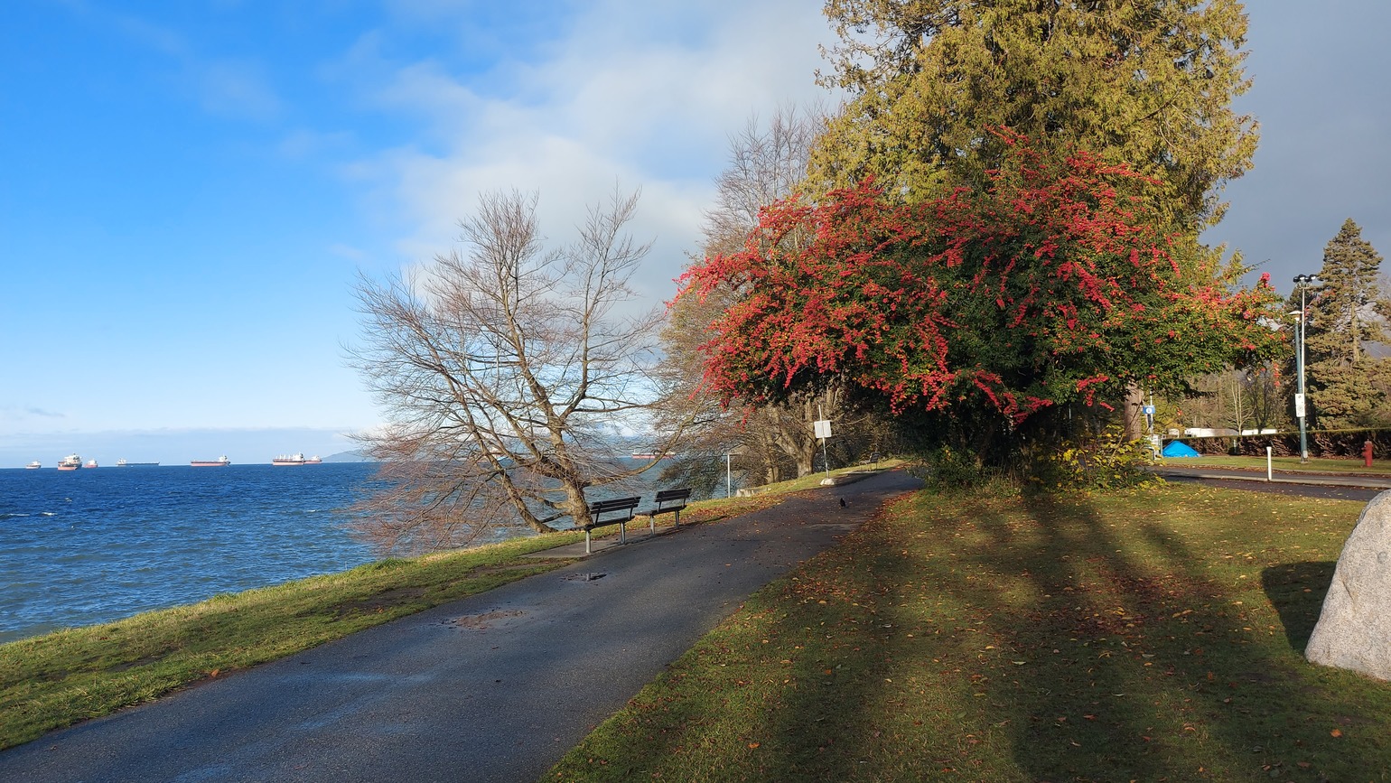 The along my walk at the seawall, this bit of glory blazed in the morning sun, with quite the English Bay panorama to dramatize. There's just no season that really puts the colour in Vancouver down.