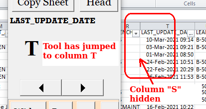 The first column is selected, and shows in blue. The arrow keys move the focus of the tool to columns right and left. Whichever column has focus shows the column-letter in huge text, and the column name (from Row#1) above that.
