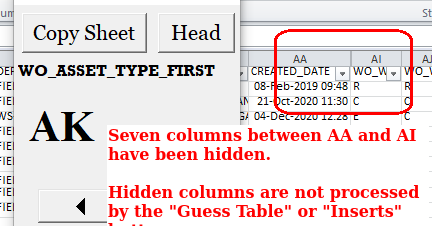 The program pops up a second window, on that sheet, so you can see the lines of table definition added to the CREATE TABLE statement as the selected column goes through every visible, that is, every not-hidden, column in the table.