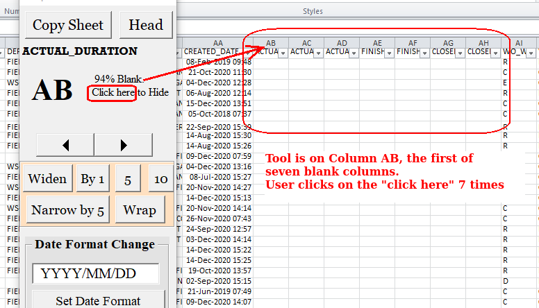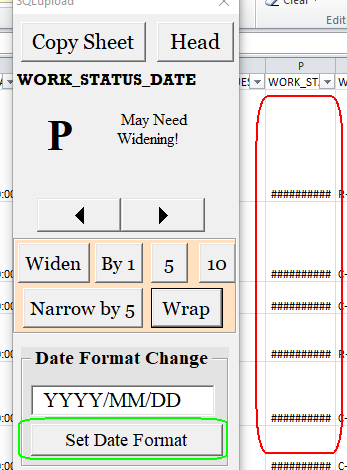 For an alternative, the "#####" date-type column at left is fixed by just clicking on the "SET DATE FORMAT" button, because the YYYY/MM/DD format is narrow enough to fit without any more widening.