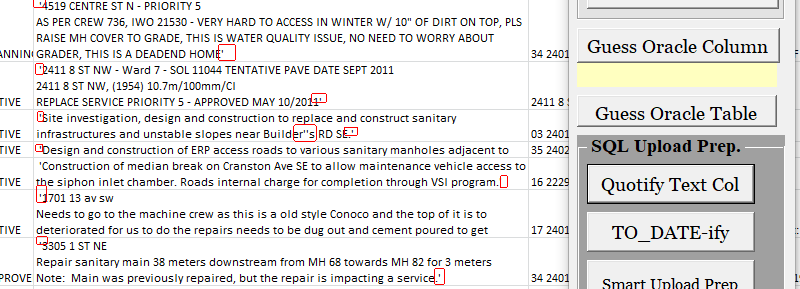 Worse, the final result needed to be uploaded to a database table in it's own right, so text had to be quoted, dates needed to be right, the INSERT statements had to have about 40 columns assembled into one long string with a huge formula.